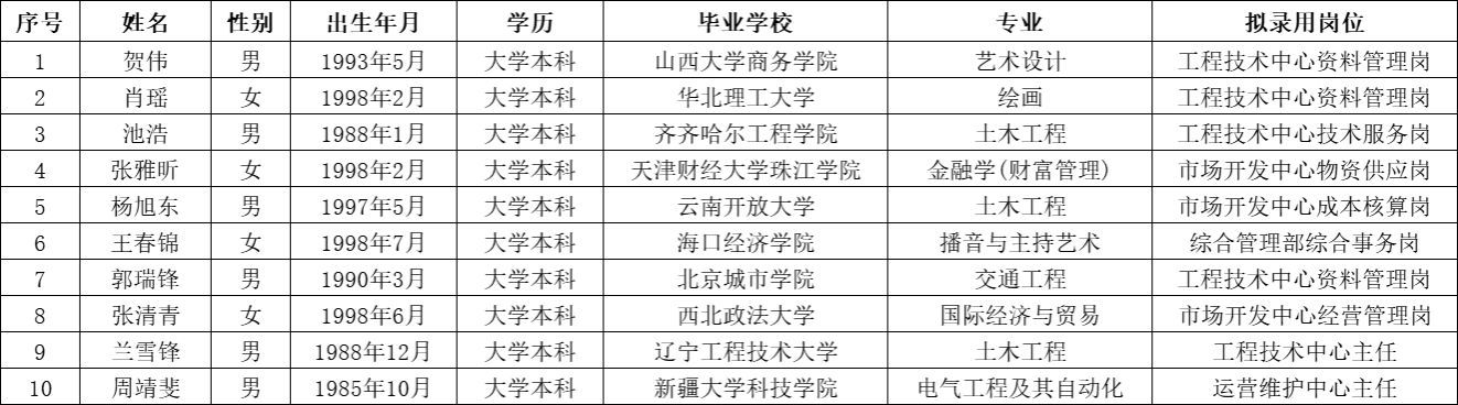 有限公司所属公司山西必通安装工程有限公司2022年公开社会招聘公告》,山西必通安装工程有限公司组织实施了公开招聘工作,经网上报名、笔试、面试、资格审查、体检等程序,拟录用10人,现将录用结果予以公示: